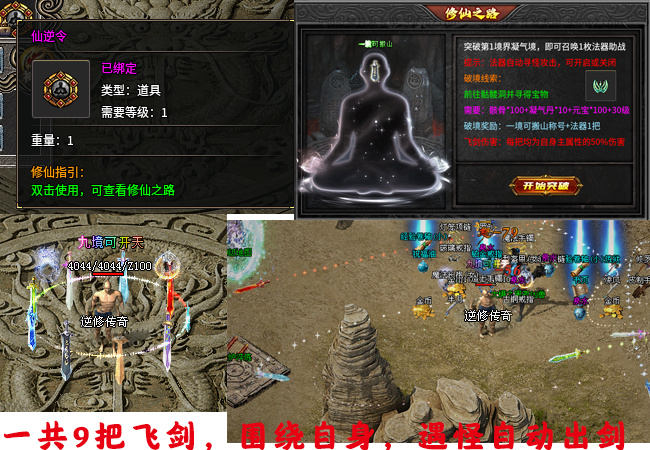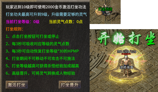 打坐一共有9个等级分9个特效,打坐获得的灵气可以兑换经验,玩家只要打坐就可以升级